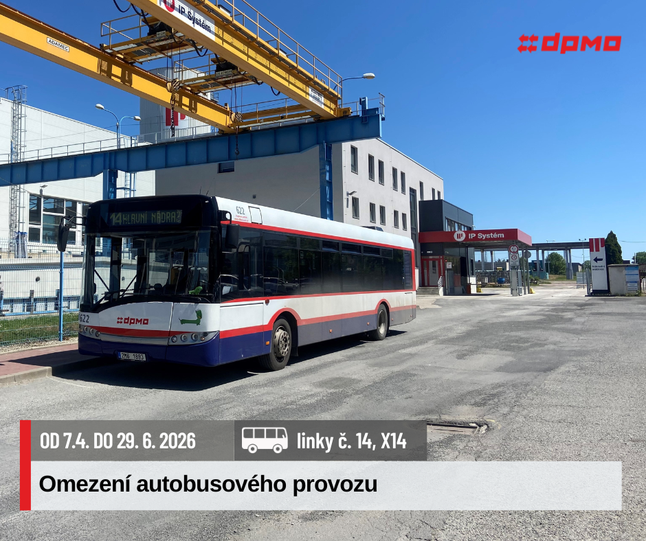 Od úterý 7. 4. 2026 do pondělí 29. 6. 2026 proběhne oprava komunikace ulice U Panelárny, včetně zastávek Dopravní stavby a Presbeton. Z tohoto důvodu dojde ke změně provozu autobusové linky č. 14.