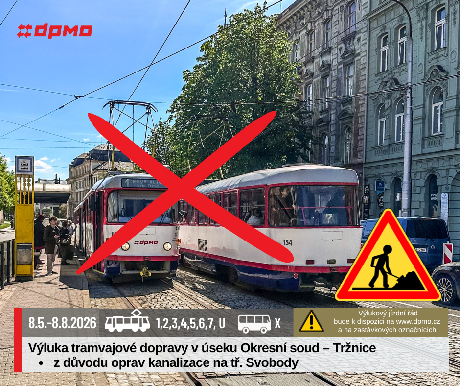 Od pátku 8. 5. 2026 do soboty 8. 8. 2026 bude vyloučena tramvajová doprava v úseku Okresní soud – Tržnice. V úseku mezi křižovatkami s ulicemi Aksamitova a Lafayettova bude v tomto termínu probíhat oprava kanalizačních vpustí.
