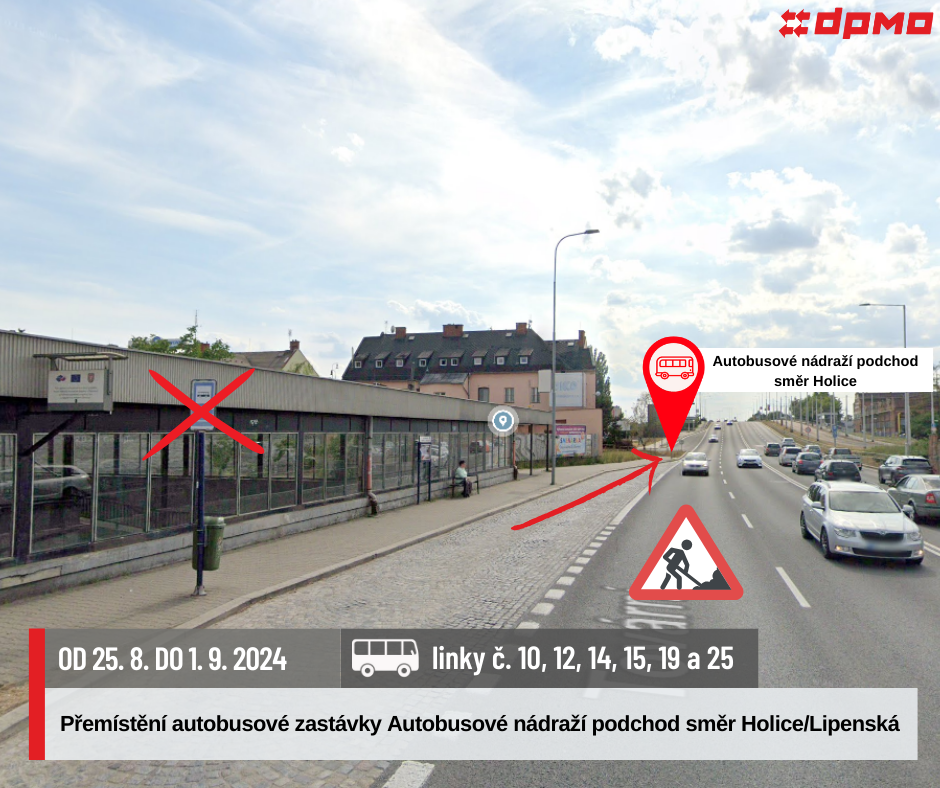 V termínu od neděle 25. 8. 2024 do neděle 1. 9. 2024 včetně budou probíhat v ulici Tovární stavební práce na opravě komunikace. V době částečné uzavírky bude autobusová zastávka Autobusové nádraží podchod směr Holice/Lipenská přemístěna k přenosnému označníku v odbočovacím pruhu cca 110 m zpět.