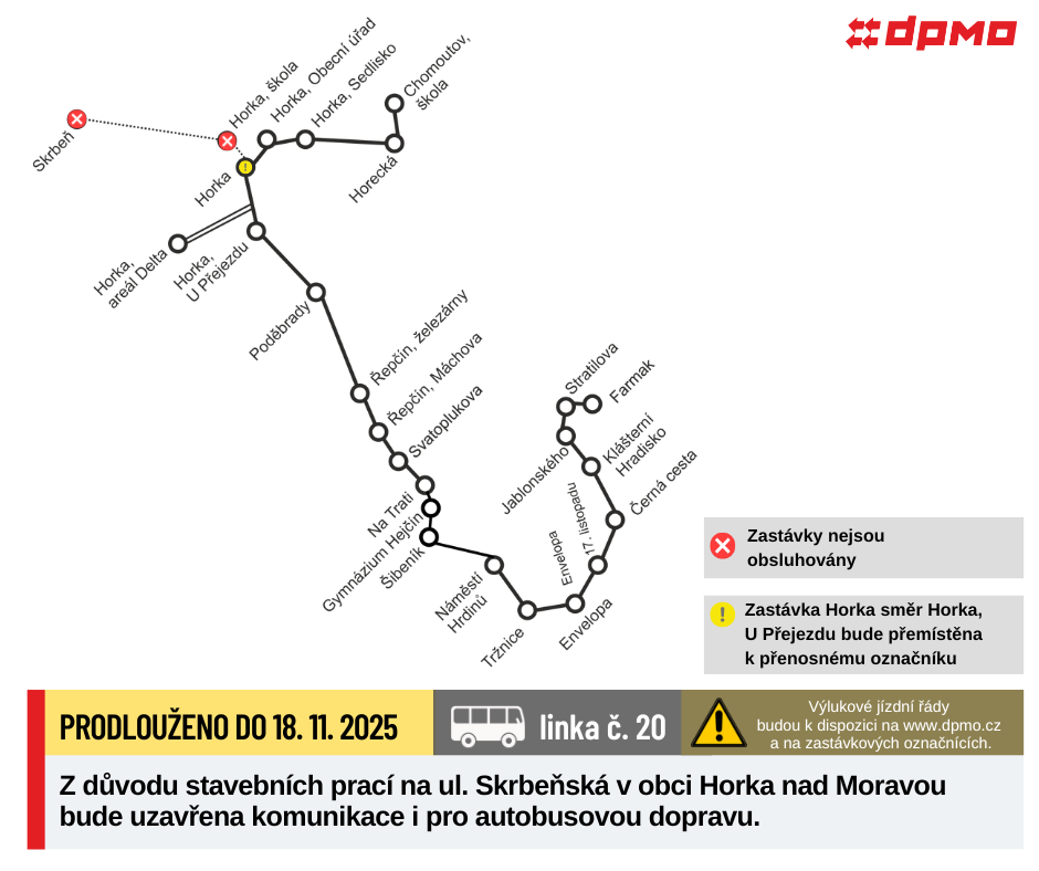 Z důvodu realizace stavebních prací na opravě vozovky v ul. Skrbeňská v obci Horka na Morovou bude autobusová linka č. 20 vedena po objízdné trase.