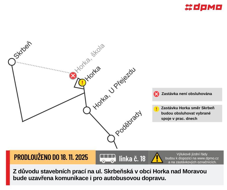 Do neděle 18. 11. 2025 včetně budou probíhat stavební práce na opravě vozovky ul. Skrbeňská v obci Horka nad Moravou, které si vyžádají uzavření komunikace i pro autobusovou dopravu.
