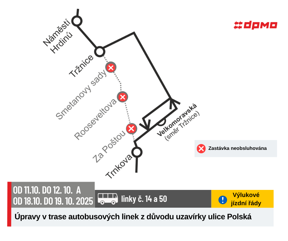 Linky č. 14 a 50 budou vedeny ze zastávky Tržnice na zastávku Trnkova po objízdné trase.