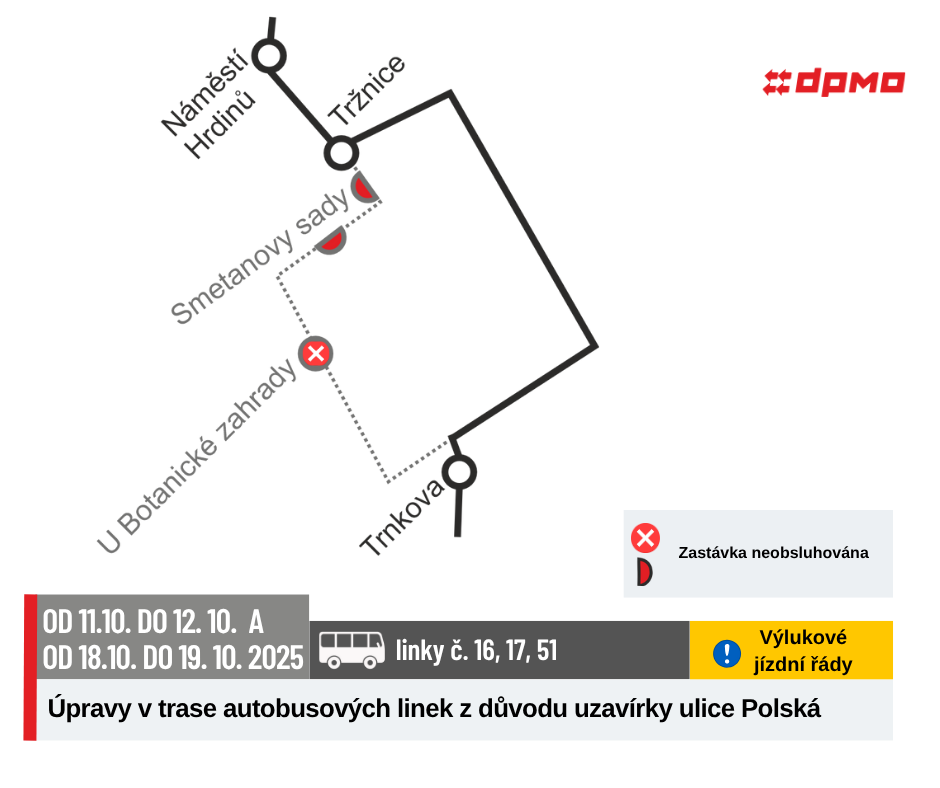 Linky č. 16, 17 a 51 budou vedeny ze zastávky Tržnice na zastávku Povel, škola po objízdné trase.