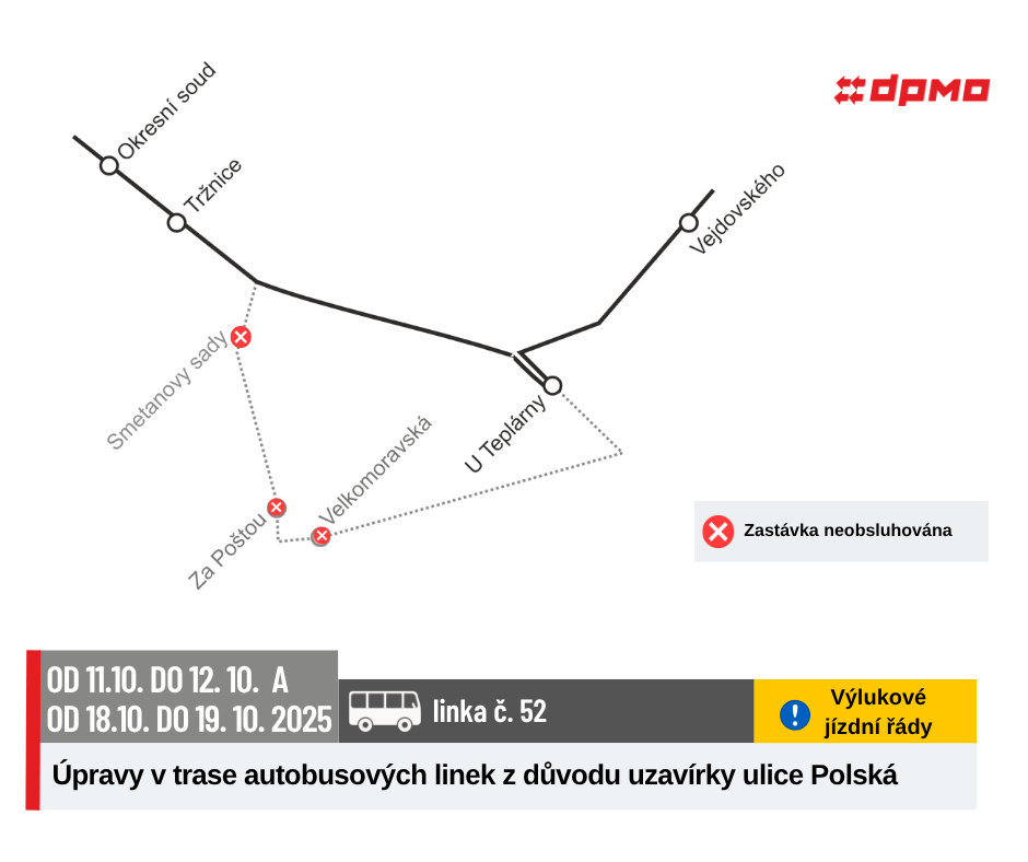 Linka č. 52 bude vedena ze zastávky Tržnice na zastávku U Teplárny po objízdné trase.
