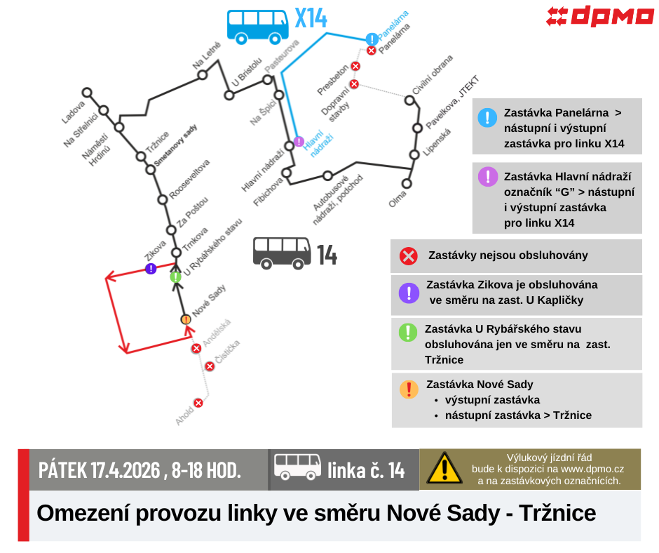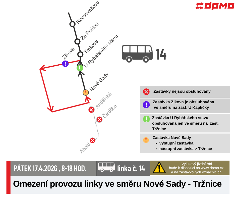 Z důvodu opravy bude železniční přejezd na ulici Dolní Novosadská uzavřen pro veškerý provoz. Autobusům bude průjezd umožněn pouze do 8.00 hod a večer od 18:00 bude už linka č. 14 jezdit bez omezení do zastávky Čistička/Ahold.