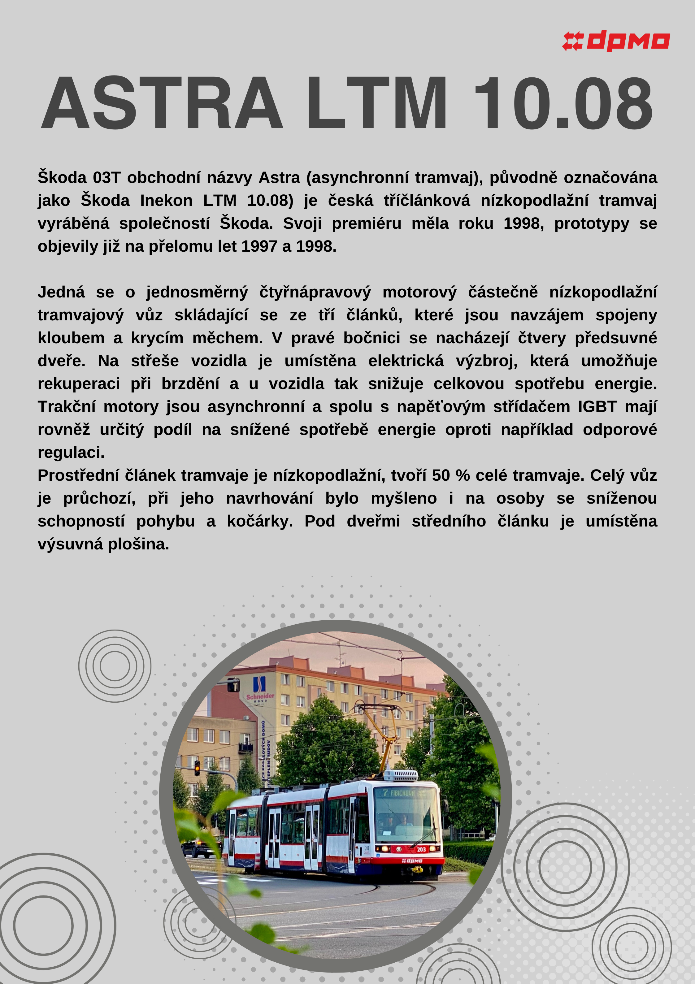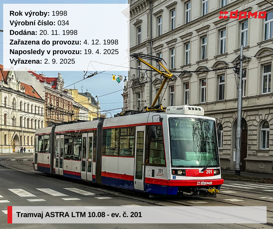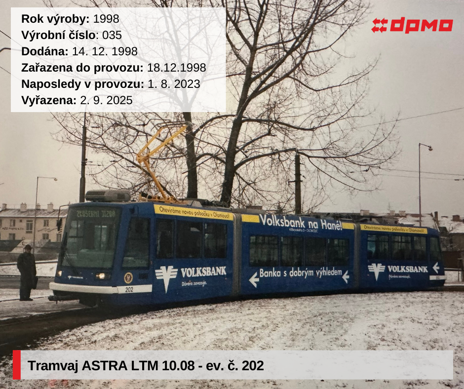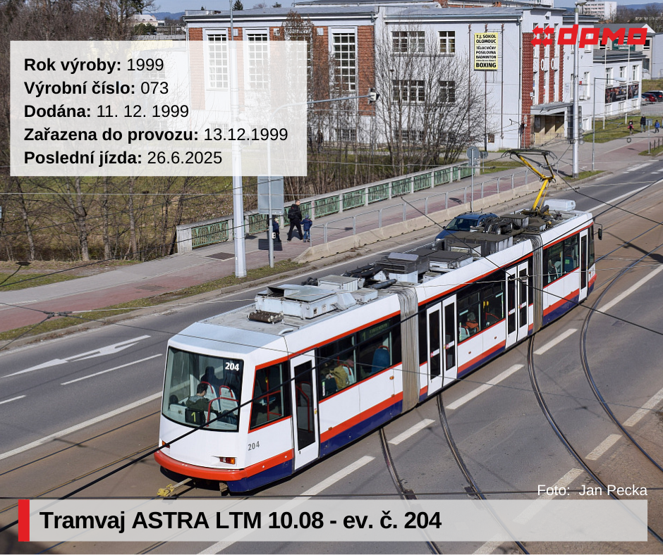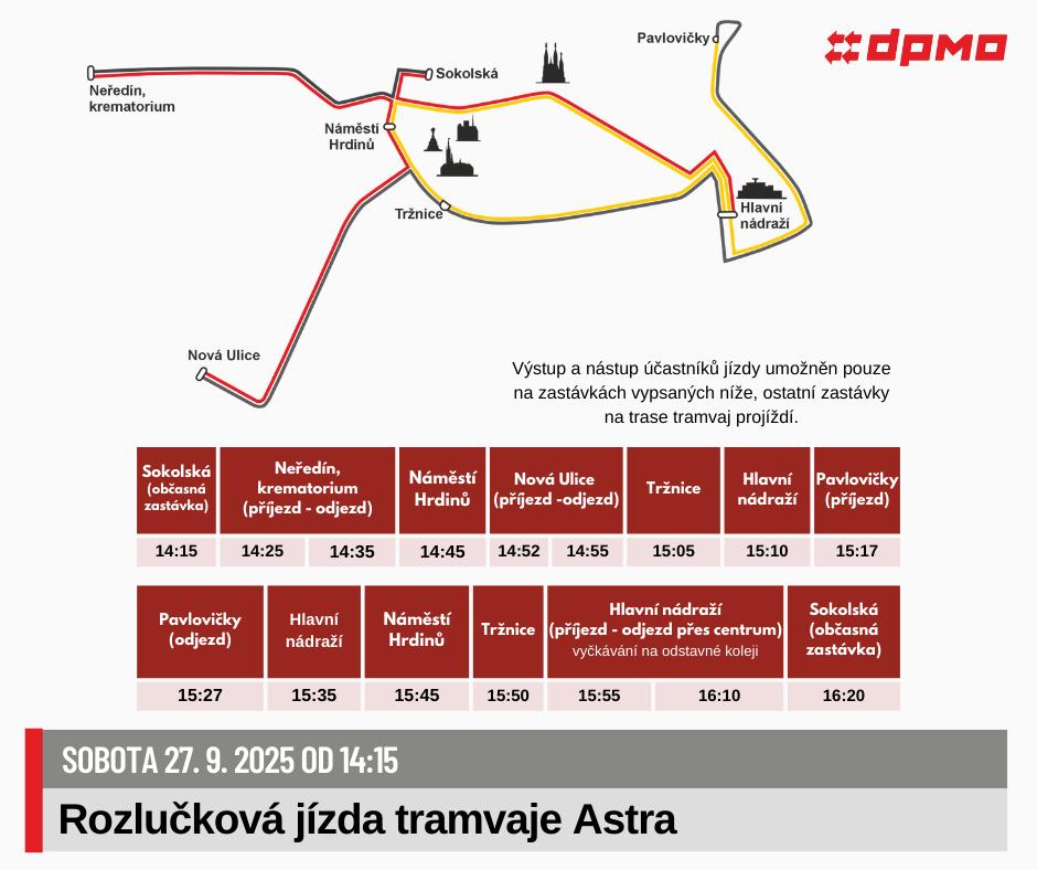 V sobotu 27.9.2025 pořádá DPMO ve spolupráci s Klubem přátel MHD rozlučkovou jízdu tramvají typu Astra. Tato jízda je určena pro všechny milovníky městské tramvajové dopravy v Olomouci a přeprava v rozlučkové tramvaji bude zdarma. Bližší informace o Rozlučkové jízdě naleznete zde > https://www.dpmo.cz/informace-pro-cestujici/aktuality/?id=831.