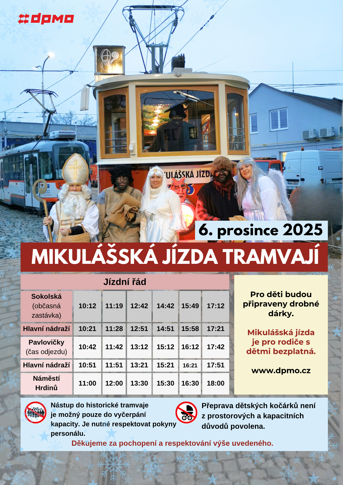 Dopravní podnik zve i na další akce. „V sobotu 6. prosince pořádáme Mikulášské jízdy, od 10 do 18 hodin se mohou rodiče s dětmi svézt historickou tramvají s Mikulášem, anděly a čerty. V neděli 21. prosince potom historická tramvaj rozveze Betlémské světlo, lidé si pro tento symbol míru budou moci přijít na konečné zastávky tramvají,“ doplnilmístopředseda představenstva DPMO, a.s. Pavel Zatloukal.