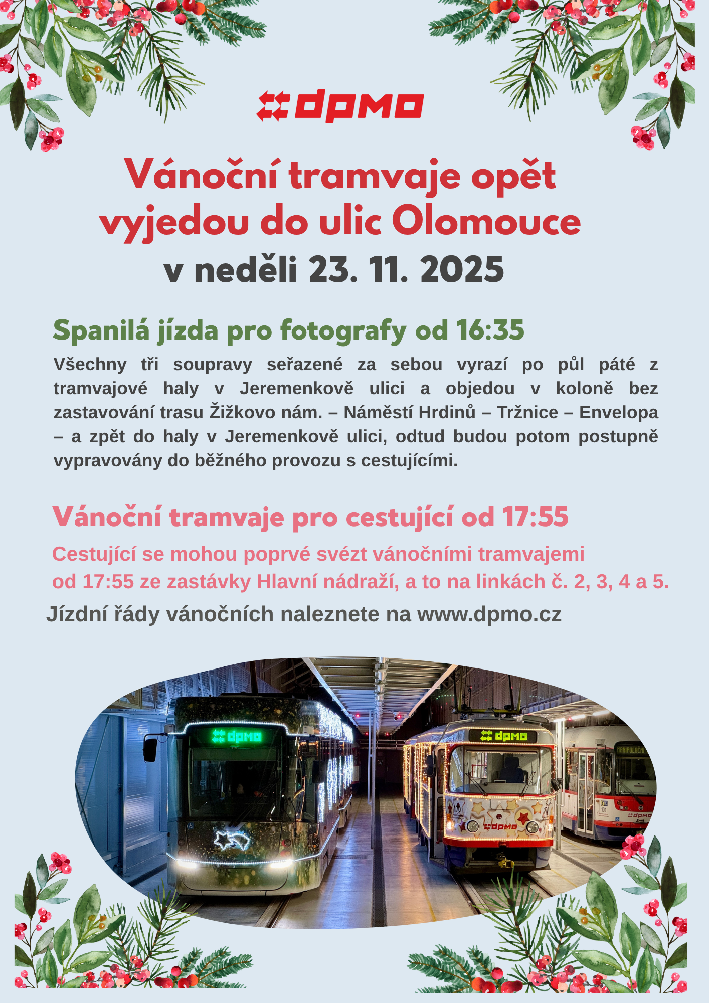 Atmosféru vánoční Olomouce už tradičně dotváří vánoční tramvaje, letos do provozu vyrazí dokonce tři soupravy těchto svátečně nazdobených vozů. K tramvajím T3 a EVO1 se přidá souprava nejnovějších oboustranných vozů EVO1/o a tramvaje tak pokryjí všechny konečné zastávky ve městě.
