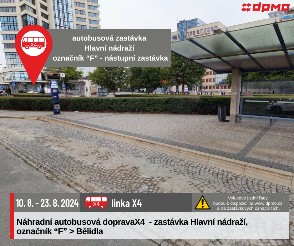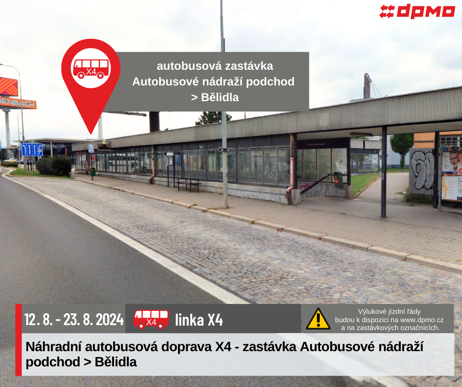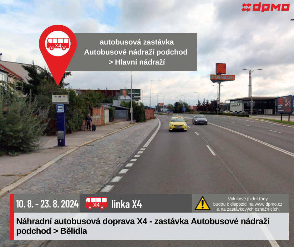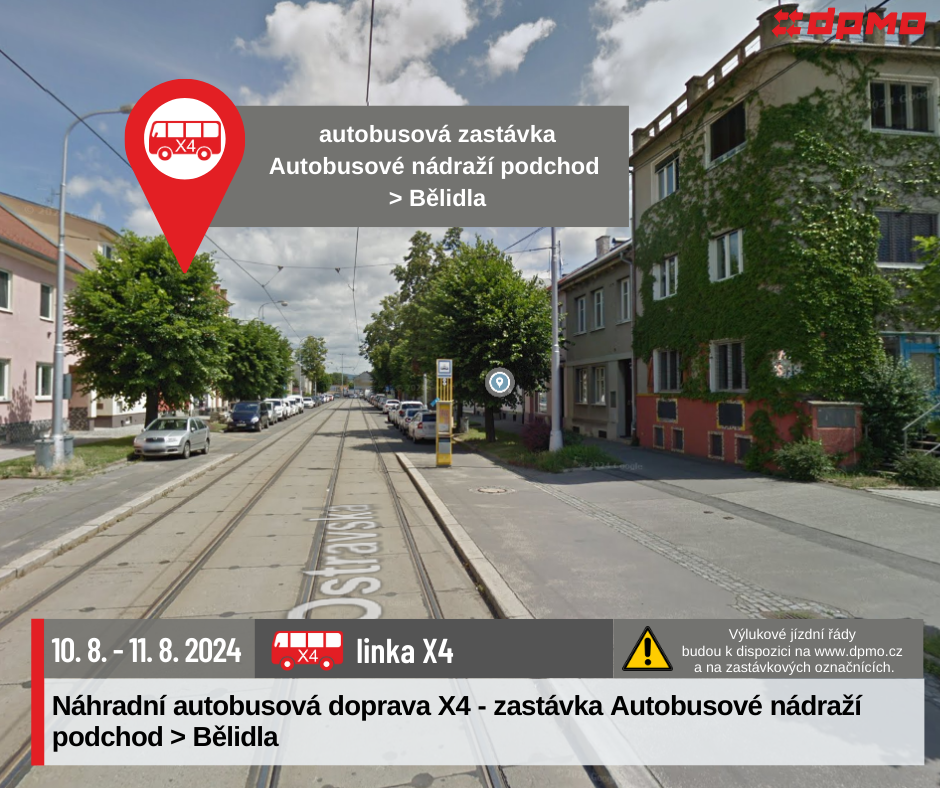 Náhradní autobusová doprava s označením X4 bude zajištěna pouze v úseku Hlavní nádraží – Bělidla. Zastávky Pavlovická a Pavlovičky nebudou obsluhovány. Pro spojení Hlavní nádraží – Pavlovičky mohou cestující využít běžné autobusové linky s odjezdy a příjezdy na zastávku Na Pile.
