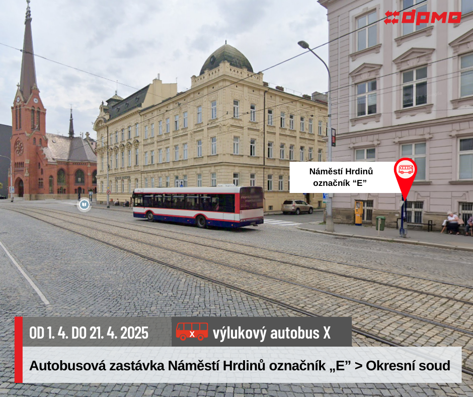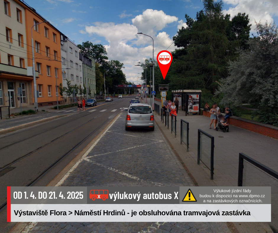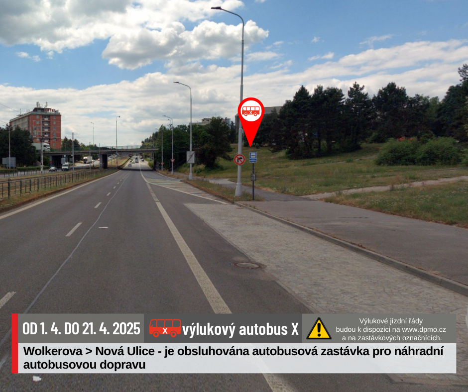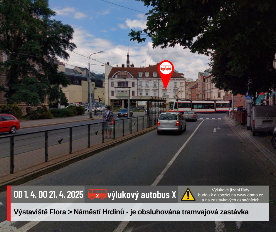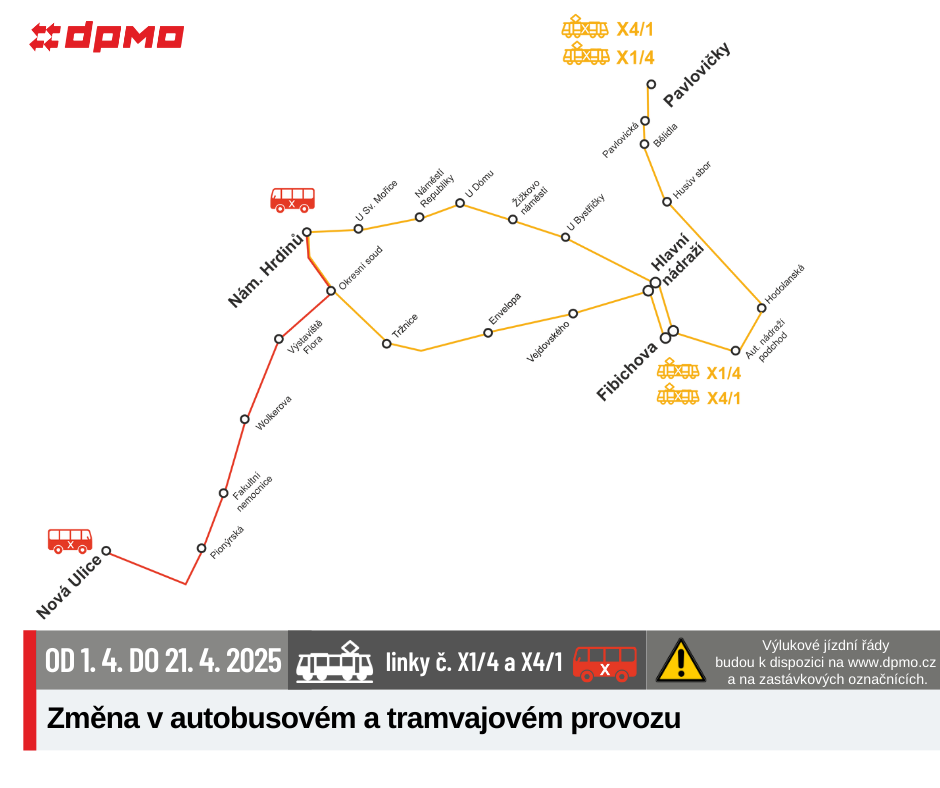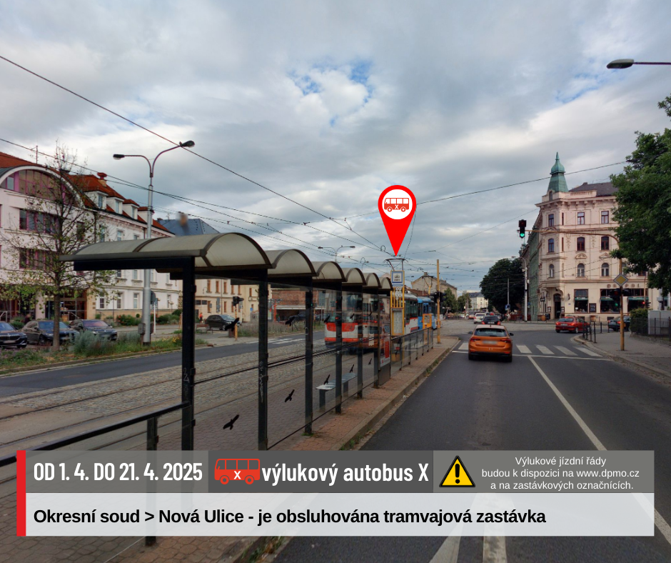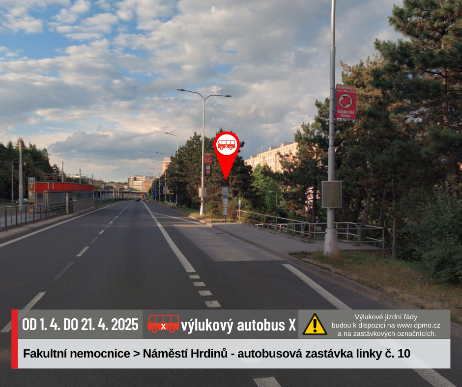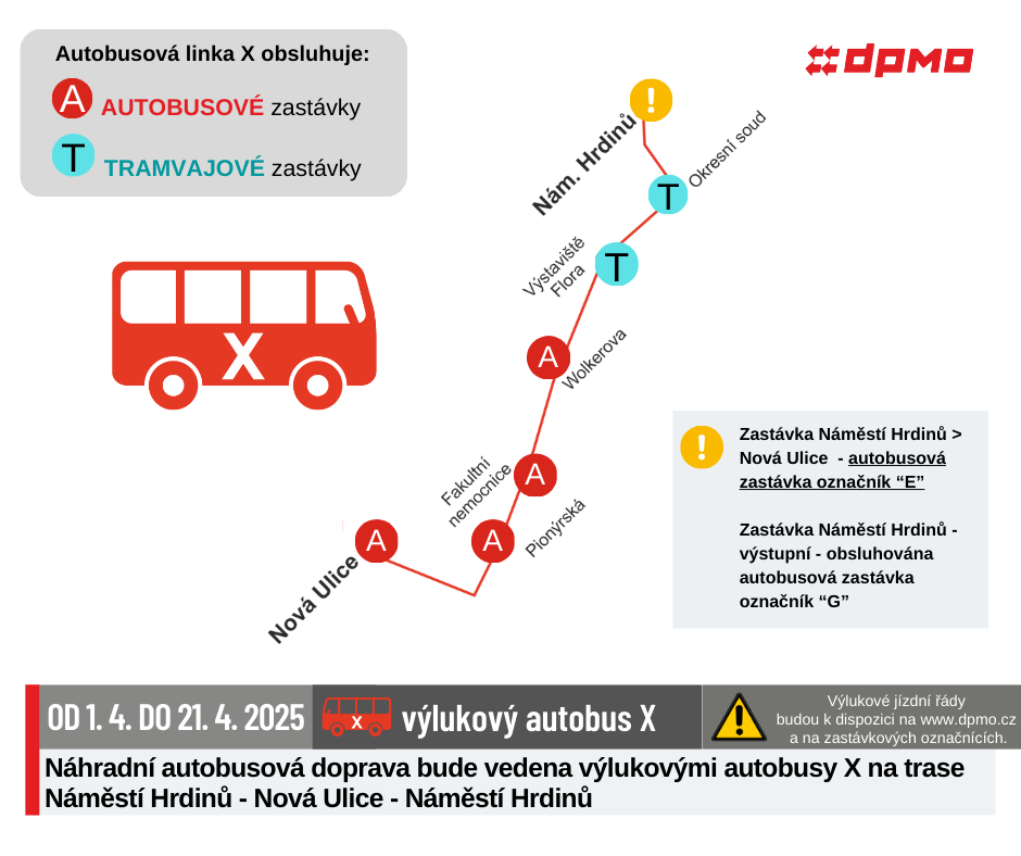 Náhradní doprava bude vedena po trase Náměstí Hrdinů – Nová Ulice – Náměstí Hrdinů výlukovými autobusy X.