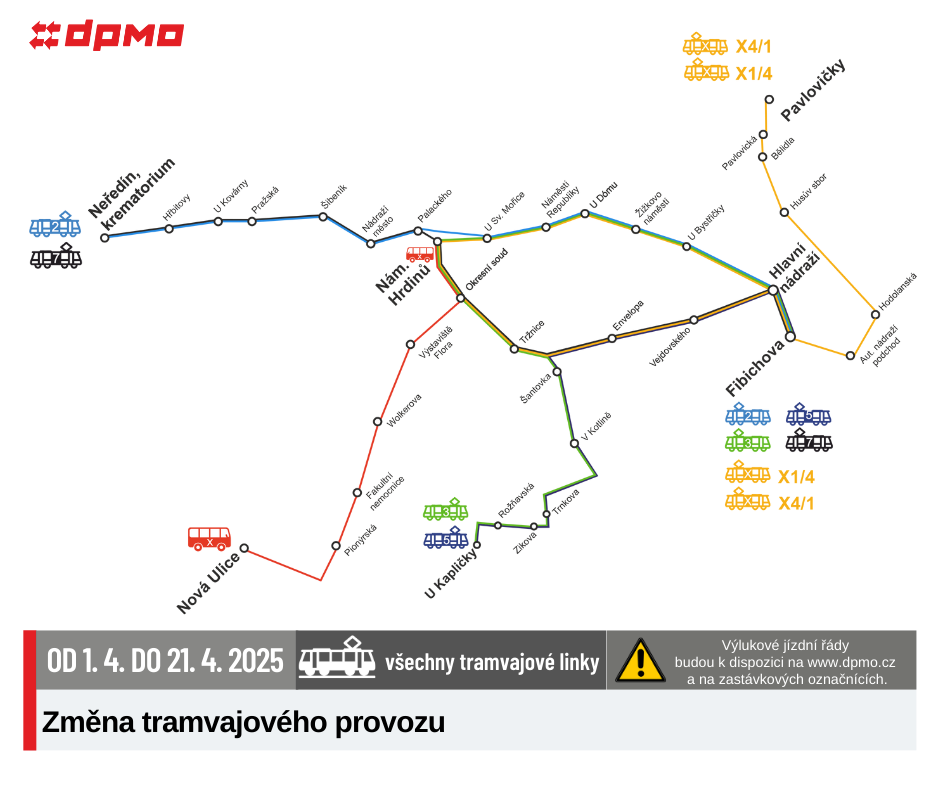 Od úterý 1. 4. 2025 do pondělí 21. 4. 2025 bude vyloučena tramvajová doprava v úseku Okresní soud – Nová Ulice. Výluka je plánovaná z důvodu vysazování rozchodníků do kolejiště v ulici Hraniční, proběhne oprava části povrchu v křižovatce Brněnská, Hraniční, kde jsou defekty v živičném krytu na tramvajové trati a v součinnosti s Magistrátem města Olomouce je v období výluky plánovaná také úprava přechodu pro chodce v ulici Havlíčkova.
