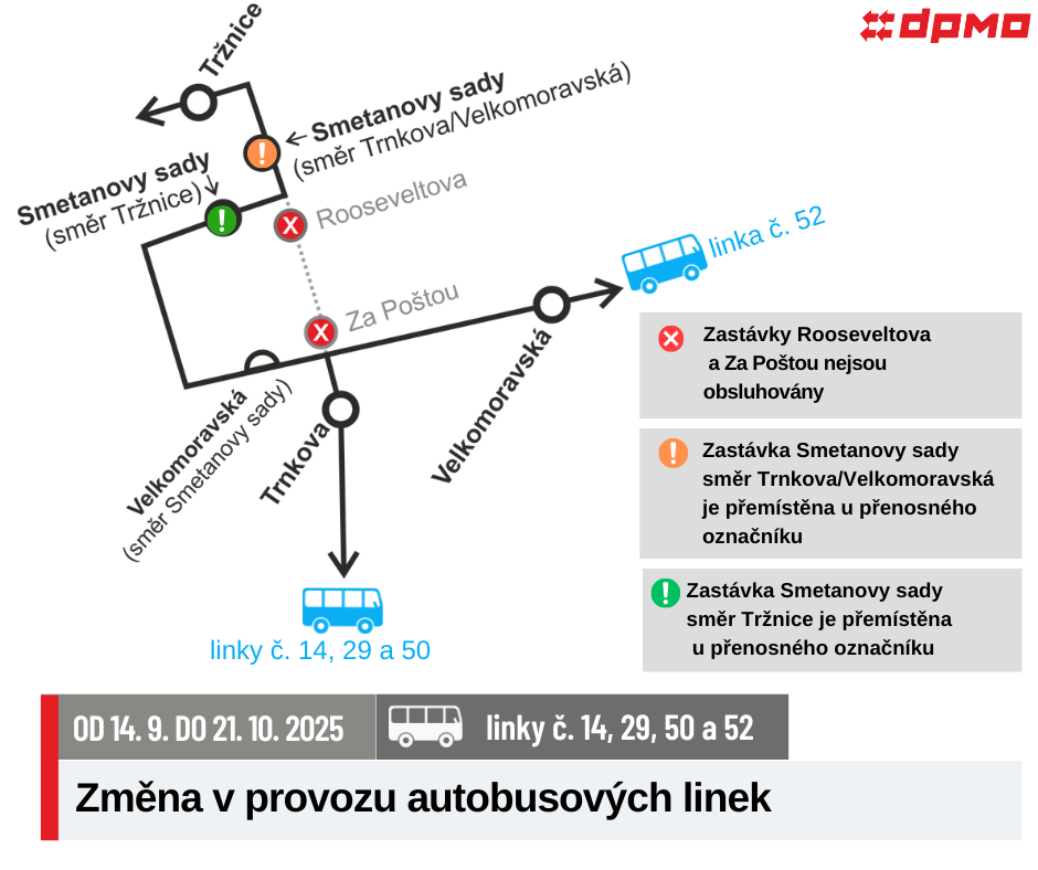 Linky č. 14, 29, 50 a 52 budou od pondělí 14. 7. 2025 mezi zastávkami Tržnice a Velkomoravská/Trnkova vedeny v obou směrech po objízdné trase.