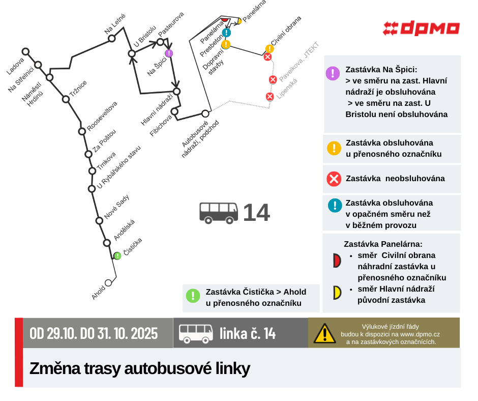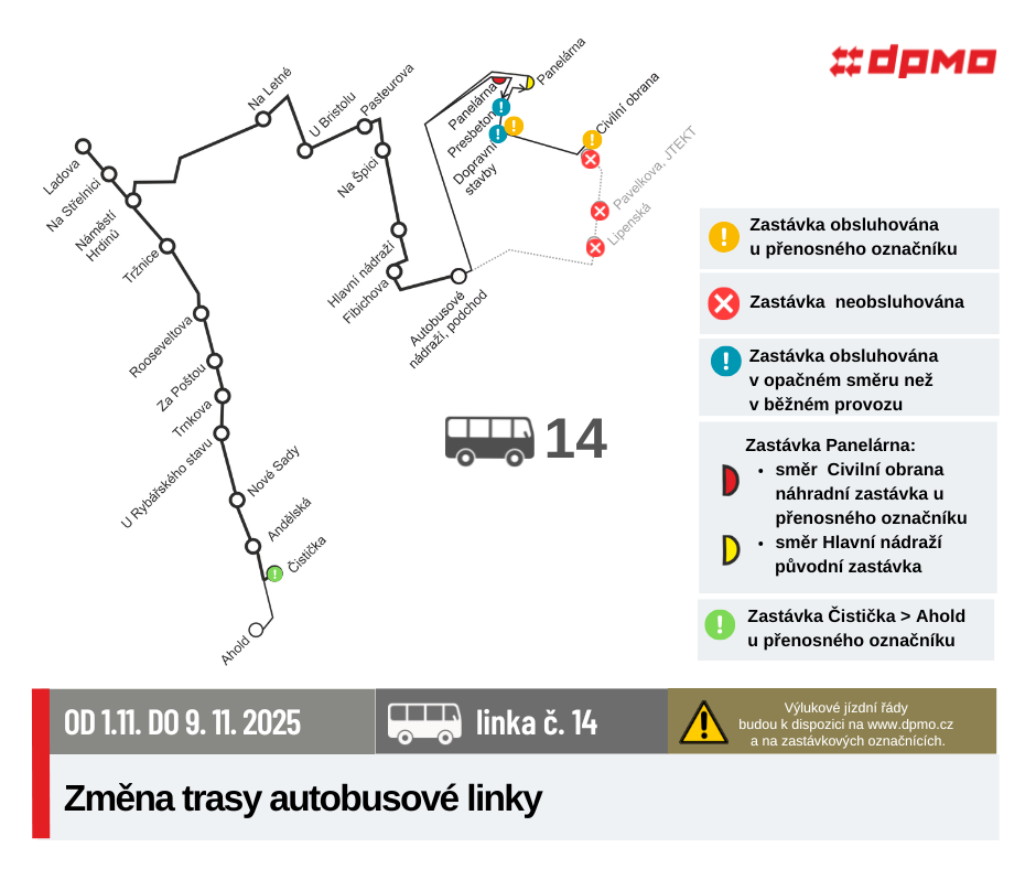 Z důvodu opravy opravy části komunikace ulice Libušina a z důvodu úpravy přechodu v ul. Pasteurova dochází k následující změně provozu linky č. 14, která je vedena v úseku Hlavní nádraží > U Bristolu a v úseku Autobusové nádraží, podchod <>Civilní obrana objízdnou trasou a je ukončena na autobusové zastávce Civilní obrana.
