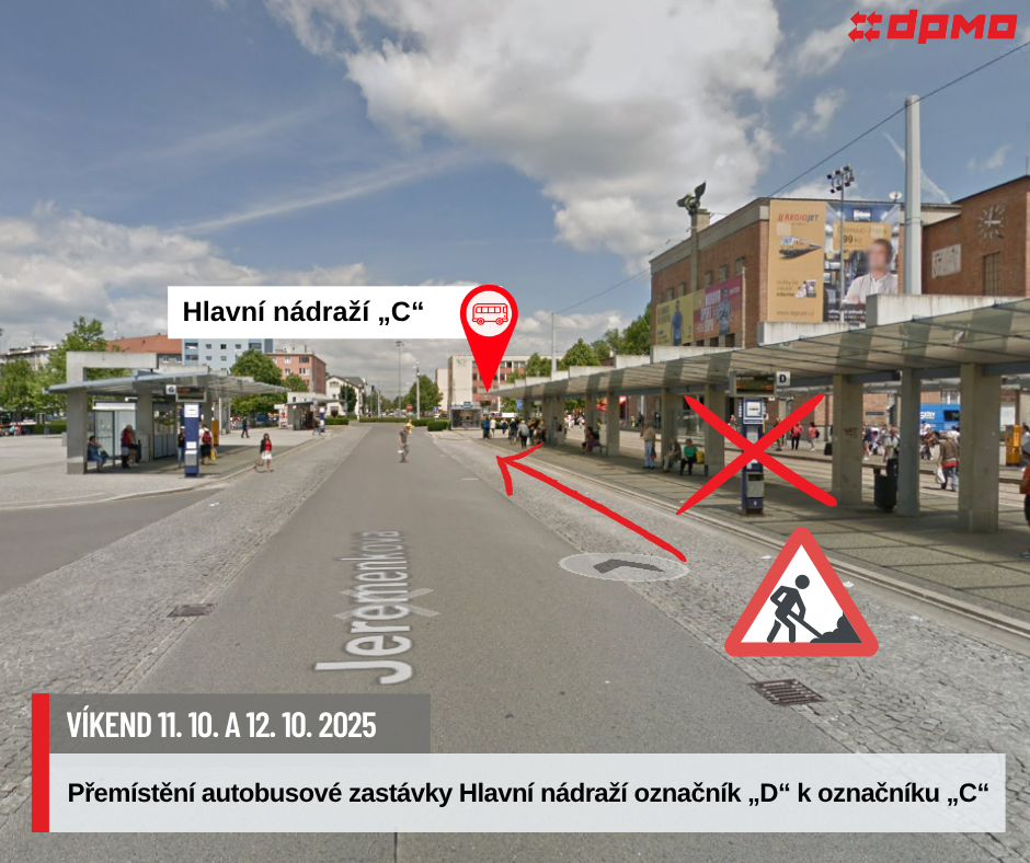 V sobotu 11. 10. 2025 a v neděli 12. 10. 2025 bude prováděna oprava povrchu komunikace v prostoru autobusové zastávky Hlavní nádraží (označník „D“) směr Na Špici. Po dobu realizace opravy bude zastávka přemístěna cca 35 metrů vpřed k označníku „C“.