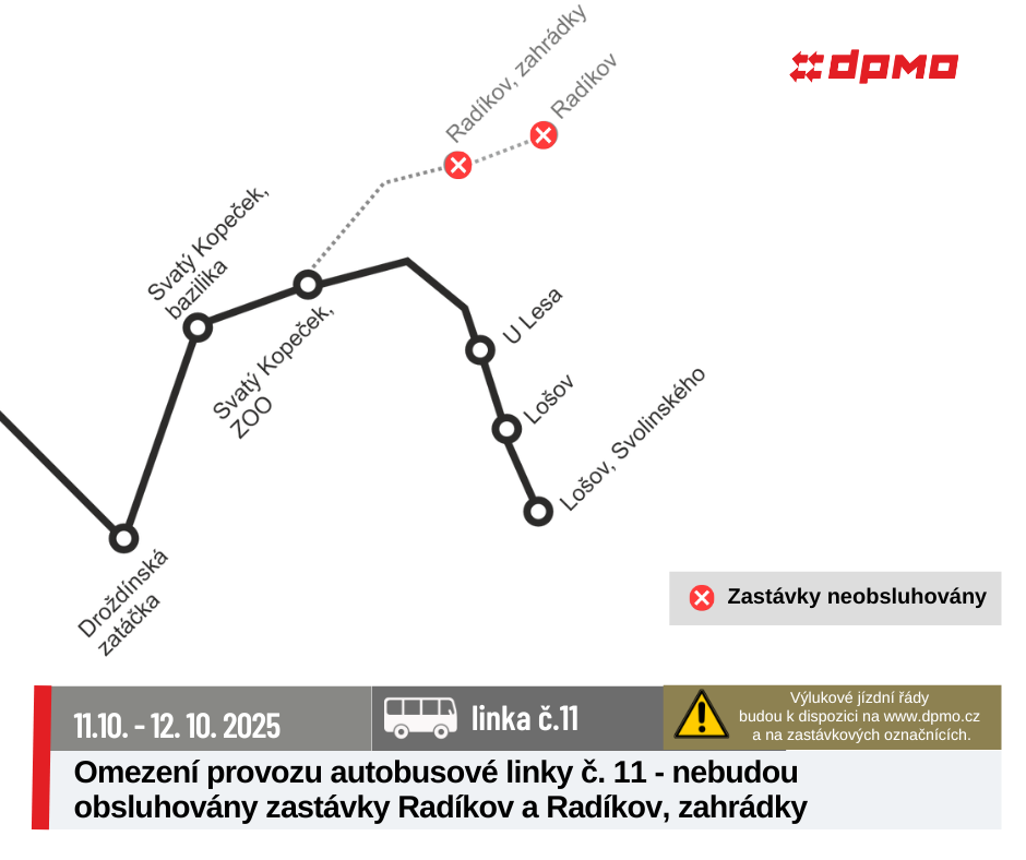 O víkendu nebude linka č. 11 zajíždět do Radíkova, ale spoje budou ukončeny na zastávce Sv. Kopeček, ZOO.