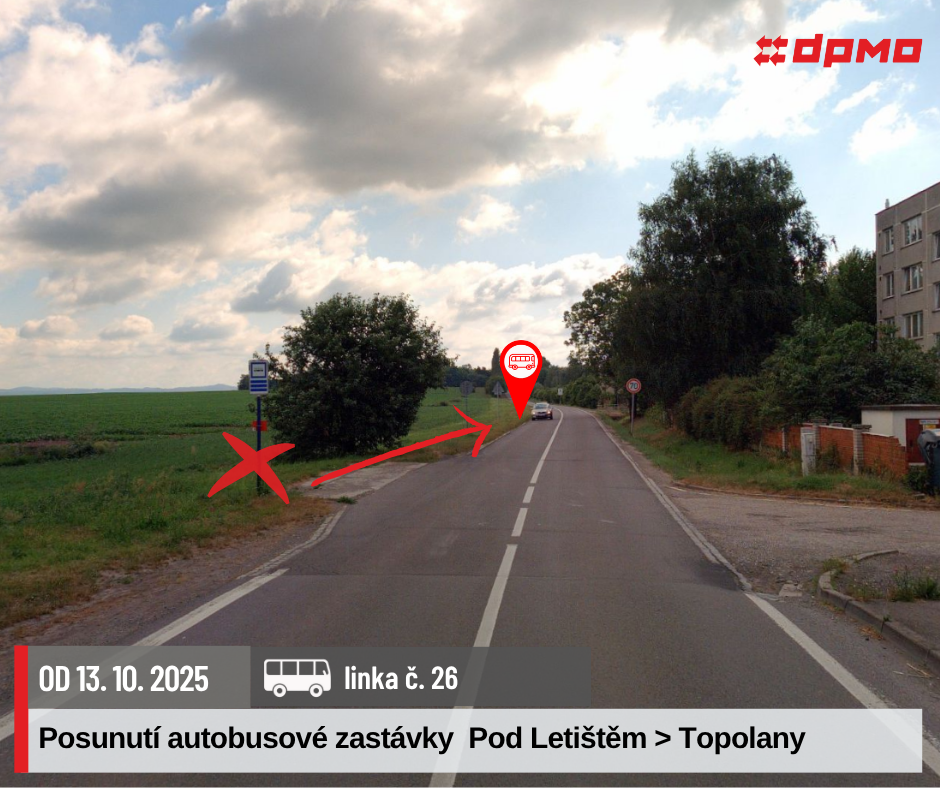 Z důvodu výstavby smíšené cyklostezky a výstavby autobusových zastávek bude od pondělí 13. 10. 2025 přemístěna autobusová zastávka Pod Letištěm směr Topolany cca 60 metrů zpět k přenosnému označníku.