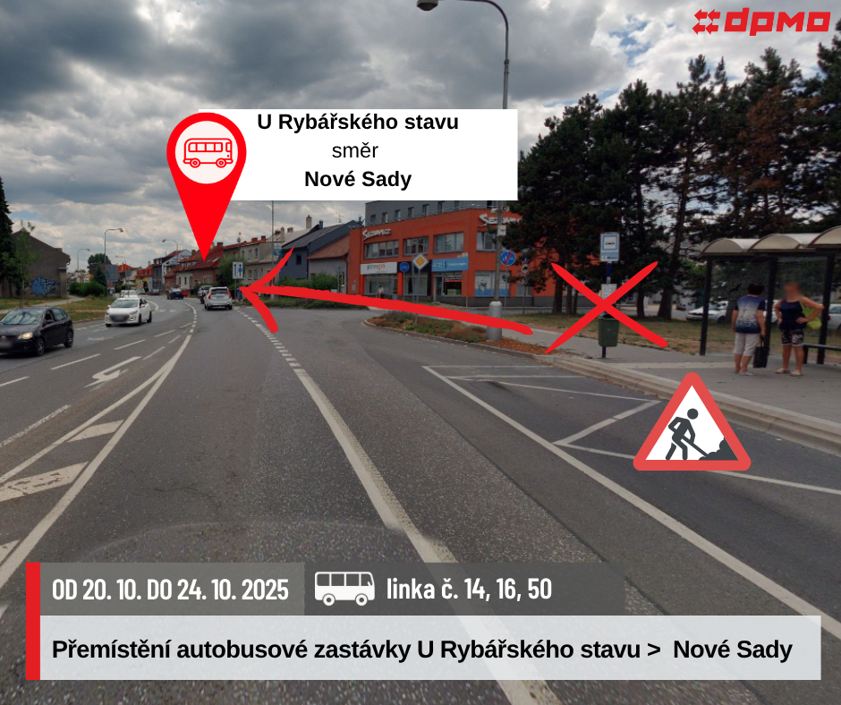 Od pondělí 20. 10. 2025 do pátku 24. 10. 2025 včetně bude prováděna oprava povrchu komunikace v prostoru autobusové zastávky U Rybářského stavu směr Nové Sady.