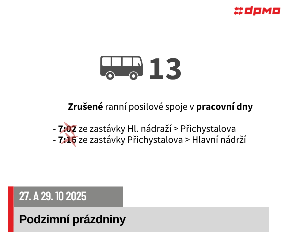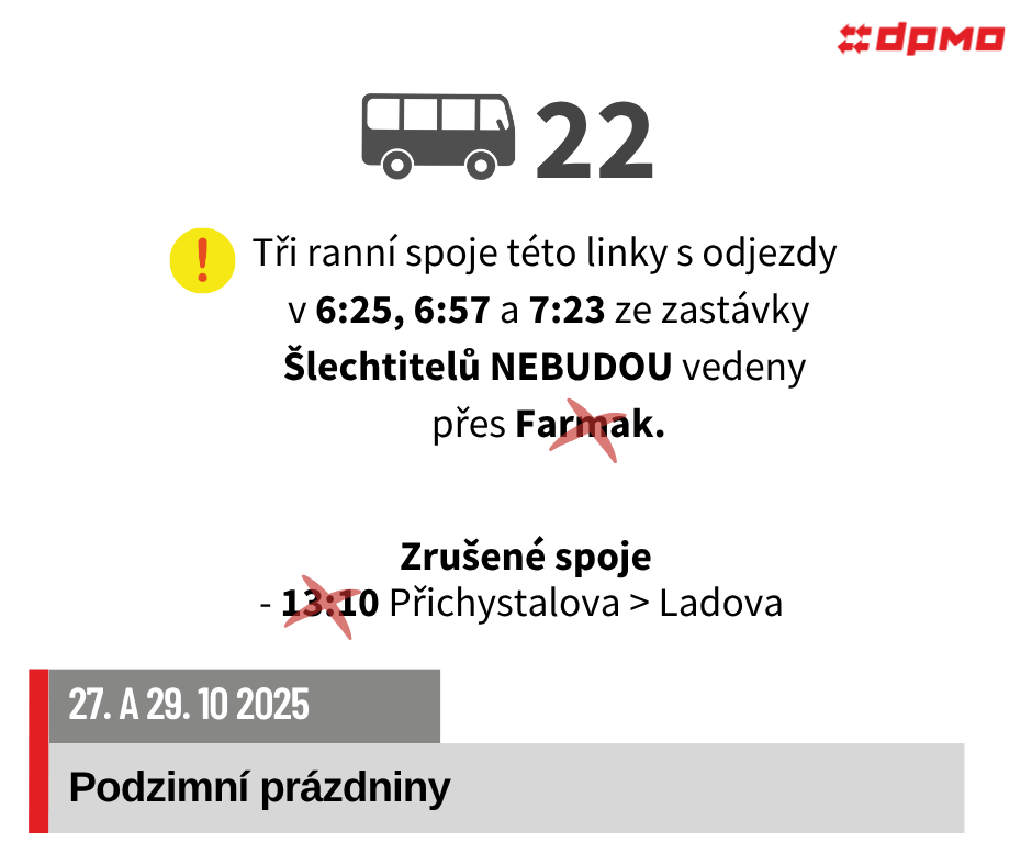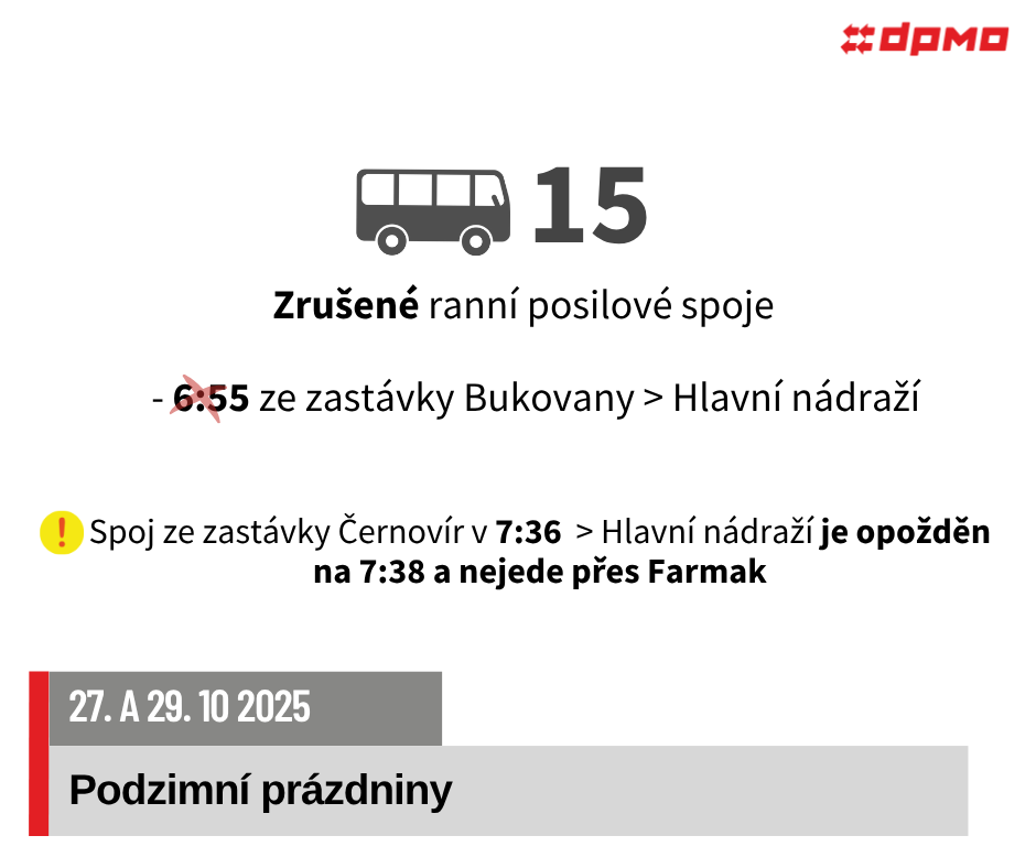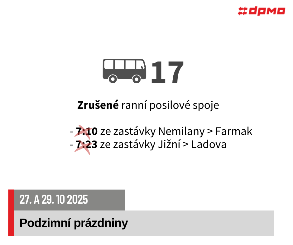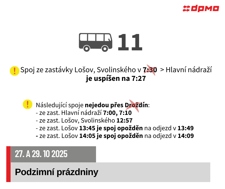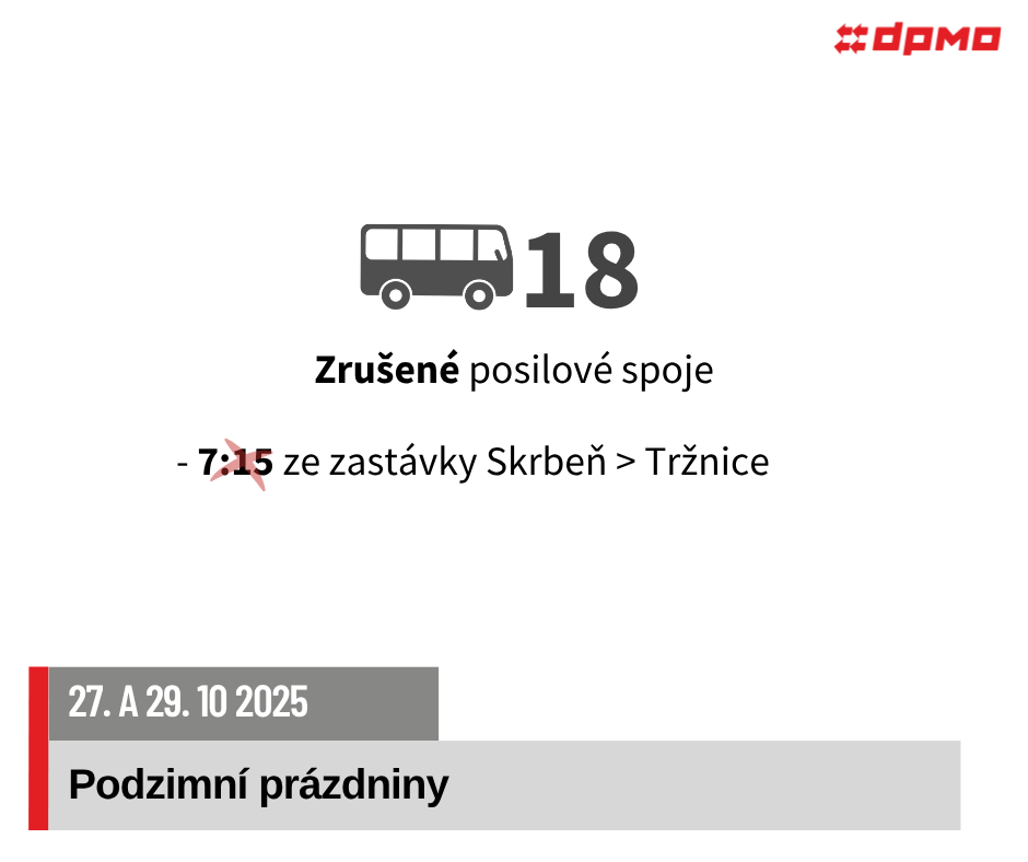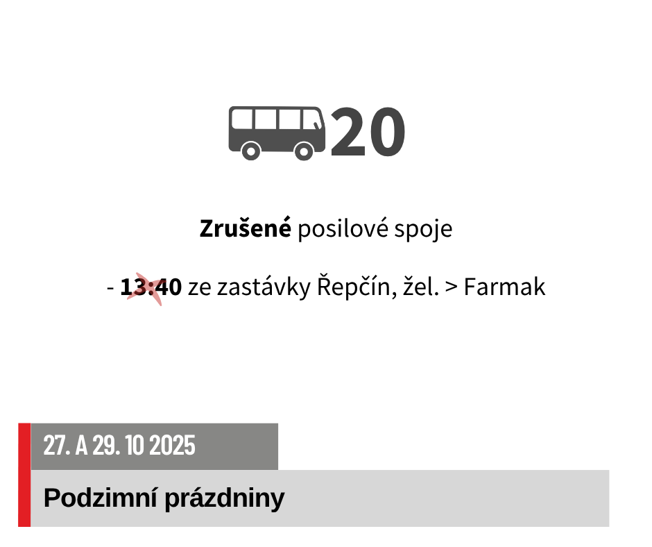 V pondělí 27. 10. 2025 a ve středu 29. 10. 2025 dojde z důvodu podzimních prázdnin k omezení nebo úpravám provozu autobusových linek č. 11, 13, 15, 17, 18, 20, 21, 22.