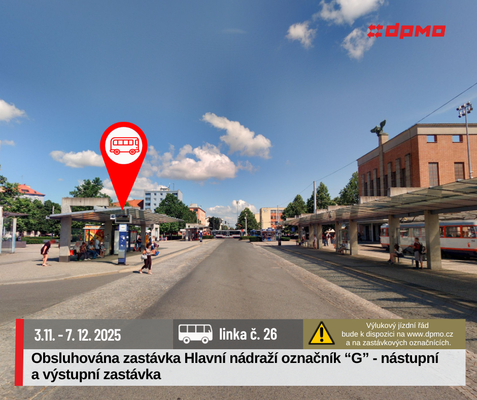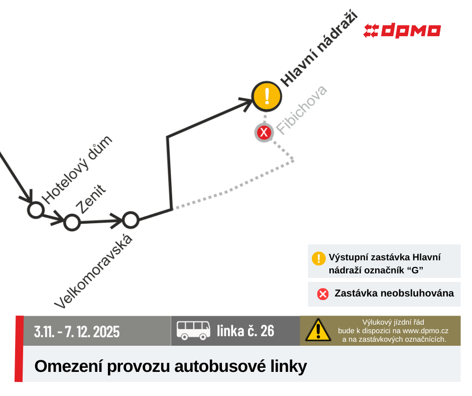 Linka č. 26 bude po dobu realizace opravy vedena ze zastávky Velkomoravská na zastávku Hlavní nádraží po objízdné trase.