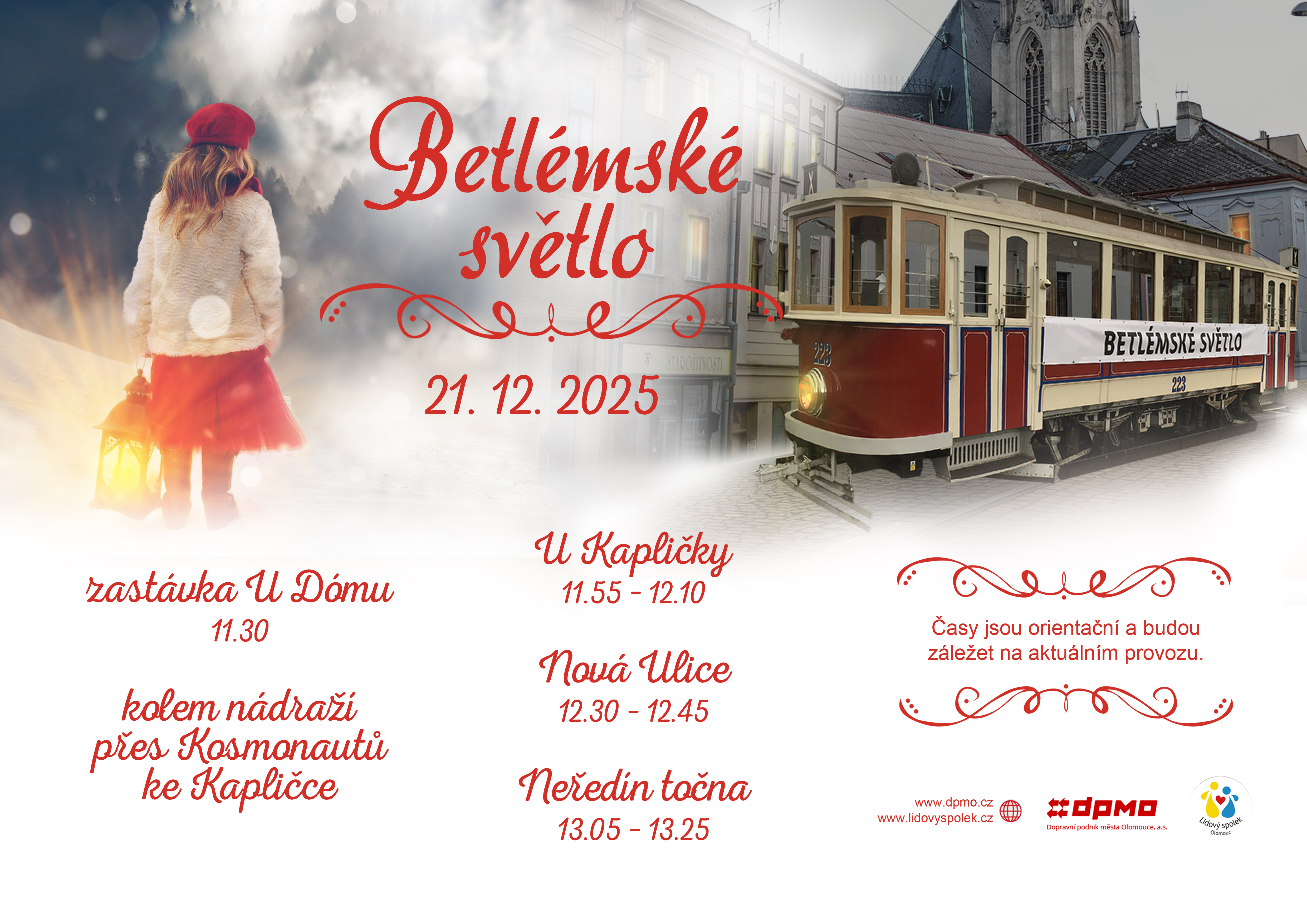 Historická tramvaj 223 rozveze na 4. adventní neděli v Olomouci Betlémské světlo. DPMO ve spolupráci s Lidovým spolkem Olomouc převezme tento symbol míru v neděli 22. prosince a kolem půl 12 s ním tramvaj vyrazí ze zastávky U Dómu.