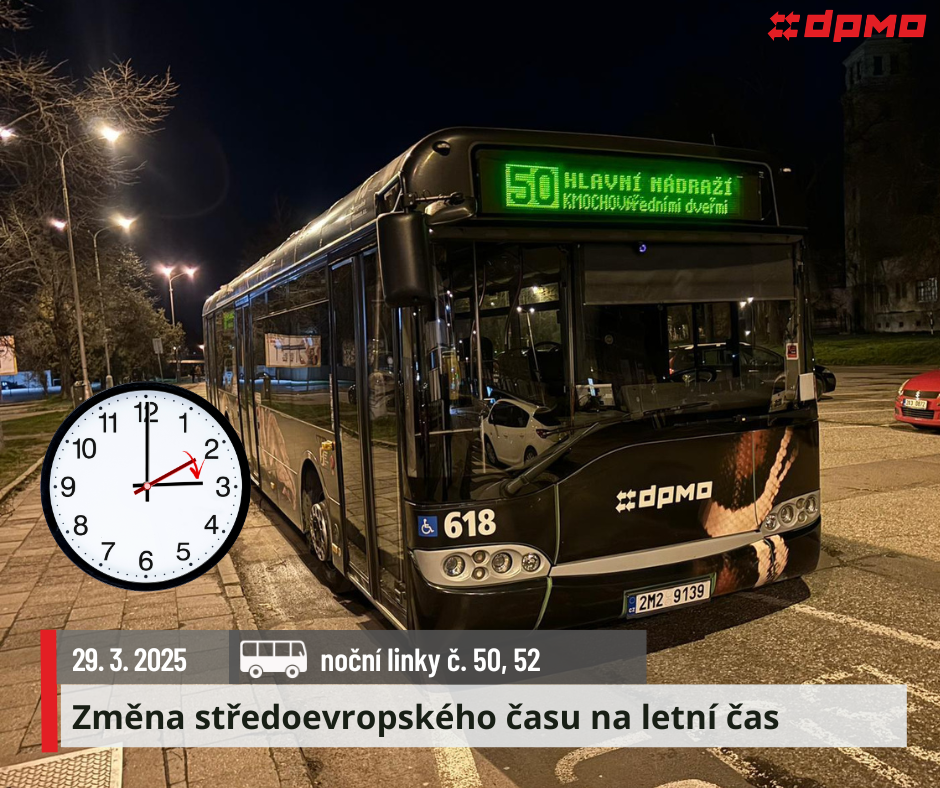 V neděli 29. 3. 2026 dojde ke změně středoevropského času (SEČ) na letní čas (SELČ). Z tohoto důvodu se ve 2.00 hod. posunou hodiny o 1 hod. dopředu, tj. na 3.00 hod. Dochází k úpravám provozu nočních autobusových linek.