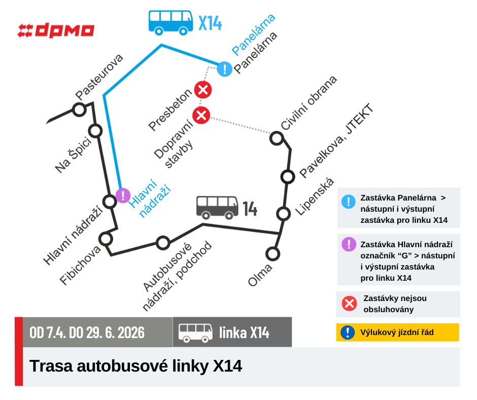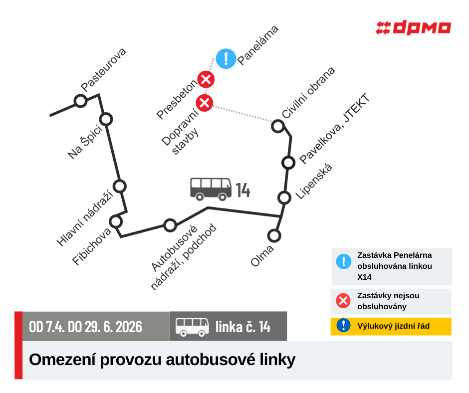 Od úterý 7. 4. 2026 do pondělí 29. 6. 2026 proběhne oprava komunikace ulice U Panelárny, včetně zastávek Dopravní stavby a Presbeton. Z tohoto důvodu dojde ke změně provozu autobusové linky č. 14.