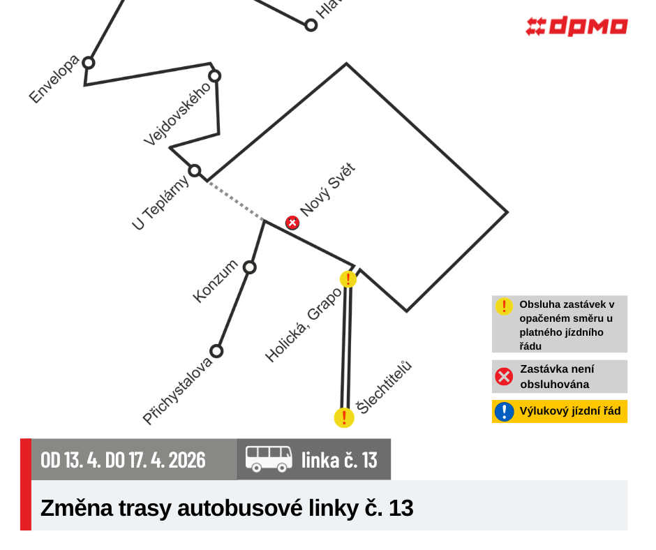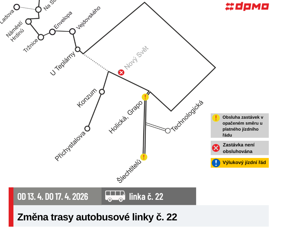 Od pondělí 13. 4. 2026 do pátku 17. 4. 2026 do 4.00 hod. bude z důvodu opravy zcela uzavřena komunikace na železničním přejezdu v ulici Holická, z tohoto důvodu budou autobusové linky č. 13 a 22 jezdit po objízdné trase dle výlukových jízdních řádů.