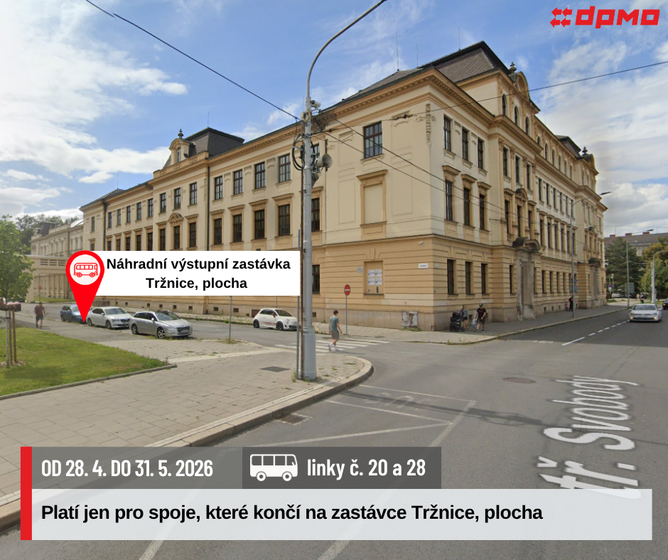 Autobusové linky č. 20 a 28 budou od 28. 4. do 31. 5. 2026 vedeny po náhradní trase do ulice Nerudova, kde bude umístěna výstupní náhradní zastávka Tržnice, plocha. Platí jen pro spoje, které končí na zastávce Tržnice, plocha.