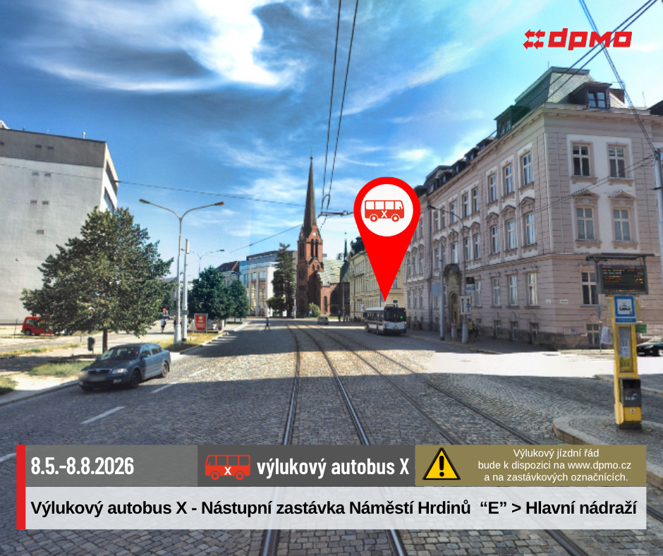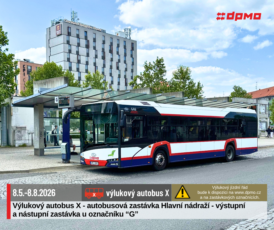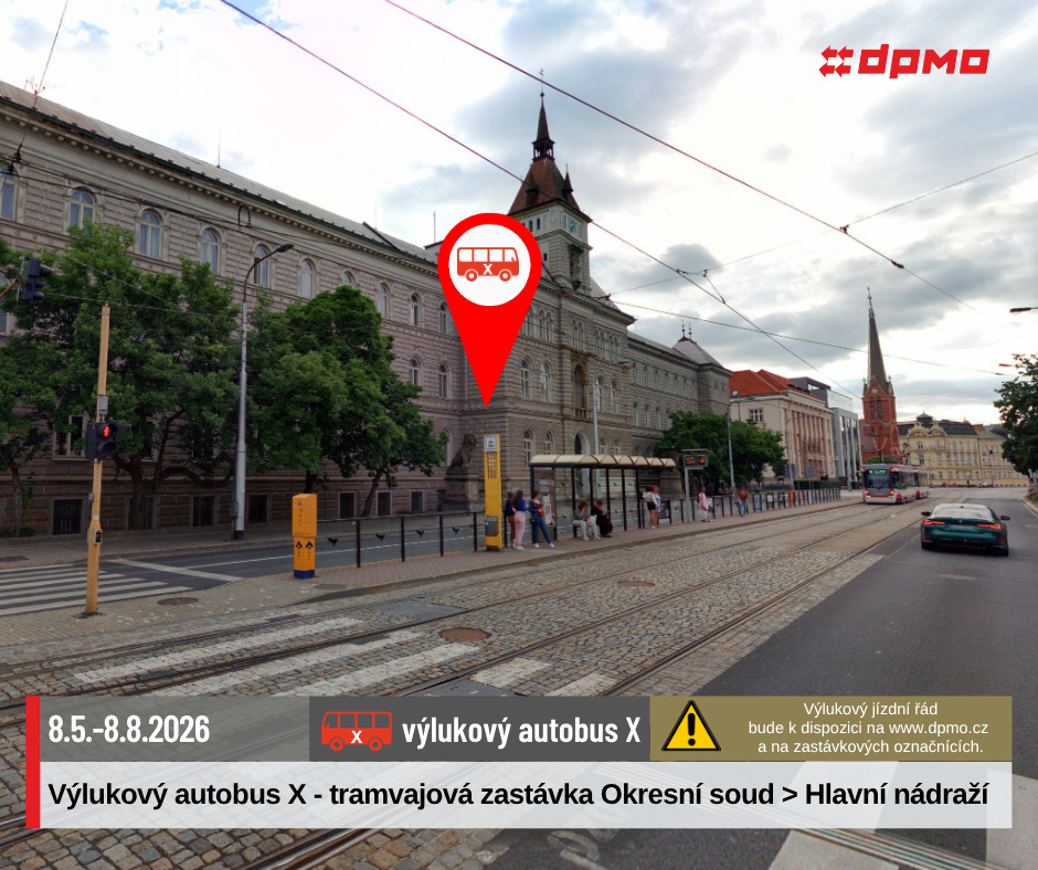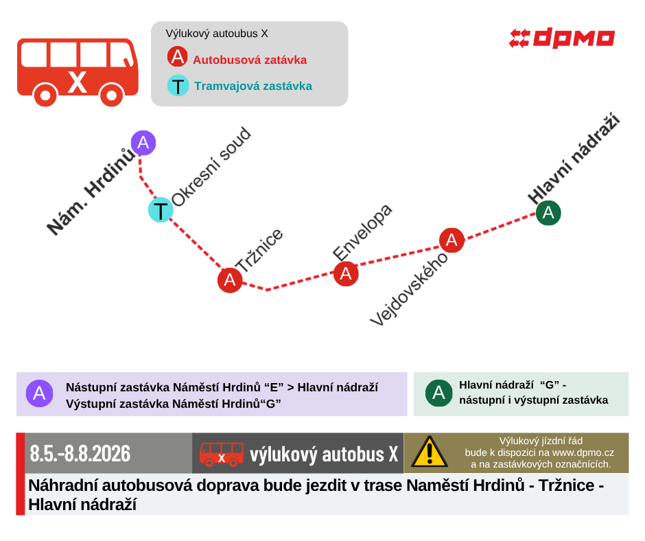 Náhradní autobusová doprava bude zajištěna po trase Náměstí Hrdinů – Okresní soud – Tržnice – Envelopa – Vejdovského – Hlavní nádraží a zpět výlukovými autobusy s označením X.