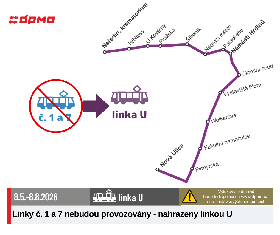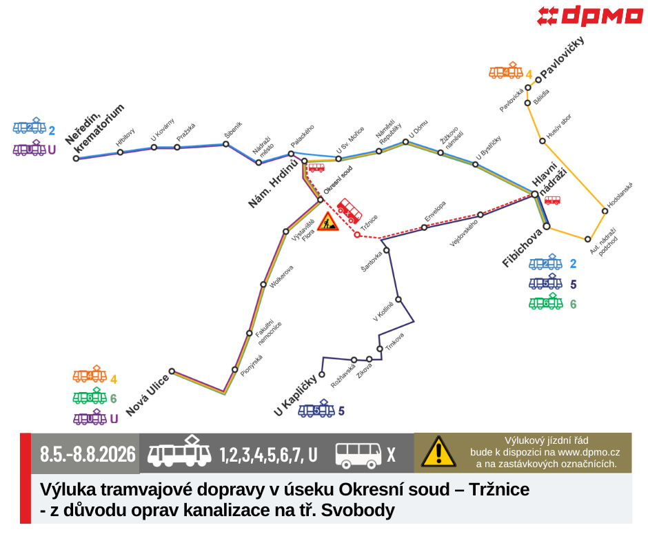 Od pátku 8. 5. 2026 do soboty 8. 8. 2026 bude vyloučena tramvajová doprava v úseku Okresní soud – Tržnice. V úseku mezi křižovatkami s ulicemi Aksamitova a Lafayettova bude v tomto termínu probíhat oprava kanalizačních vpustí.